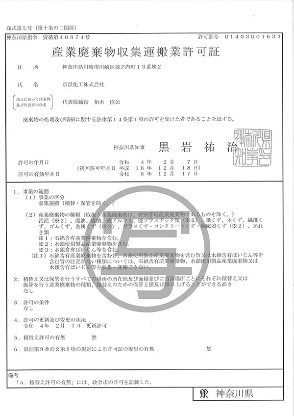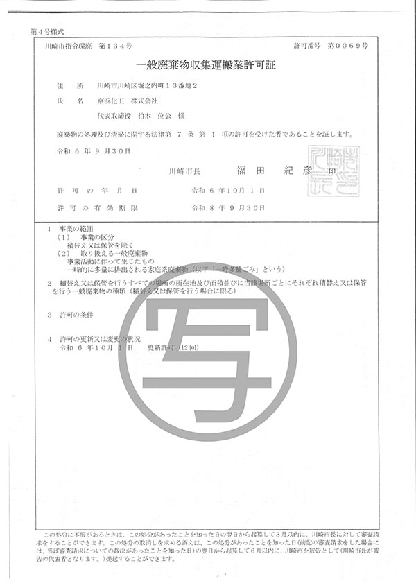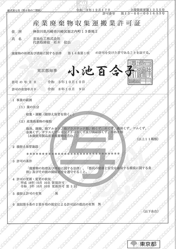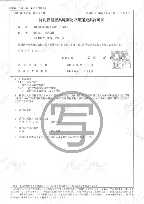 - 特別管理産業廃棄物収集運搬業許可証川崎市